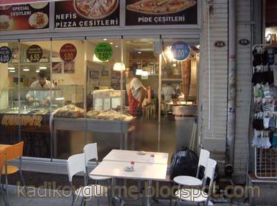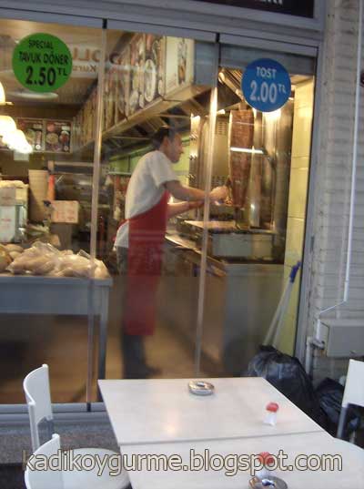 Bu poz ayaküstü çekildi, ama gizli çekil(e)medi. Fotoğraf çekildiğini fark eden dönerci ustamız camekan arkasından bariz ve sevimli bir vücut diliyle poz vermek istemiş, almış eline döner bıçağını, başlamış kesmeye. Sağ olsun. (Miş'li cümlelerimden de anlaşılacağı gibi fotoğrafları ben çekmedim, gizli gurmeliğin şanını bozmadım yani! O yüzden fotoğrafları çeken arkadaşın yalancısıyım!)Yalnız, ben Amerikan salatasının (ya da nam-ı esas Rus salatasının) dönere yakışmadığı kanaatindeyim. Sandviçime koydurmuyorum zaten. Soğuk Savaş yıllarında propaganda amacıyla ismi manipüle edilmiş bu salatayı ben oldum olası sevemedim gerçi. En yakıştığı yer olan sosisli içinde dahi –ki o vakit ismi goralı oluyor, malumunuz– sanki sadece yiyeceğiniz şey ağırlaşsın diye konuyormuş gibi geliyor. Durak Büfe’de döner sandviçinize ekletip ekletmemek size kalmış, ben koydurmamanız tavsiyesinde bulunayım...